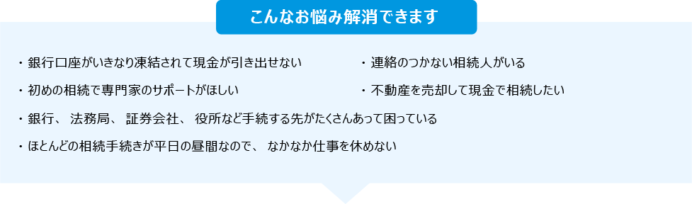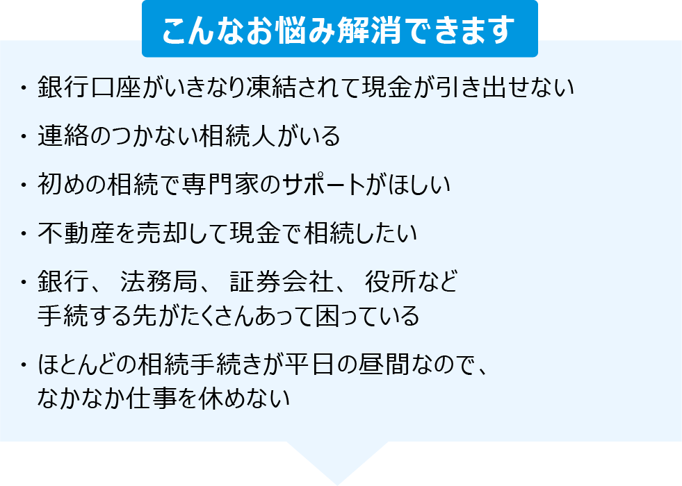 内容としては、相続人や相続財産の調査から始まり、遺産分割協議書を作成して、各相続財産の名義変更や解約の手続きを行い、保険金の請求サポート、相続税申告や遺族年金の手続きの相談まで、各専門家が全面的にサポートします。