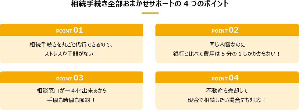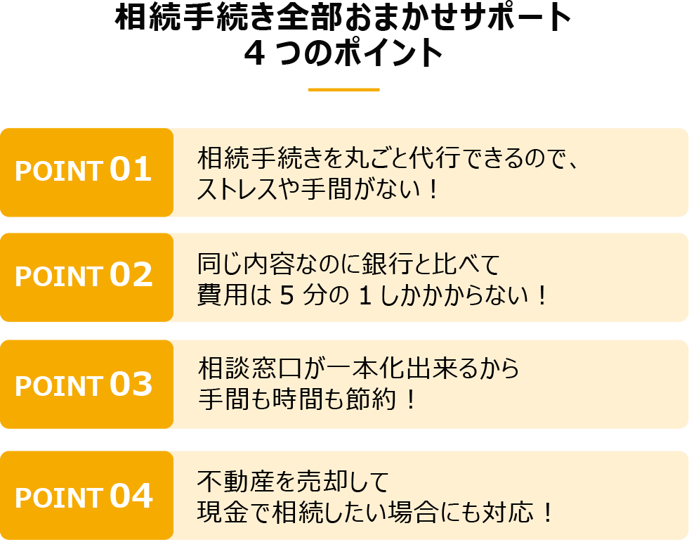 相続手続き全部おまかせサポートとは、相続に強い専門家がタッグを組み、複雑で多岐にわたる相続の手続きを一括して行います。