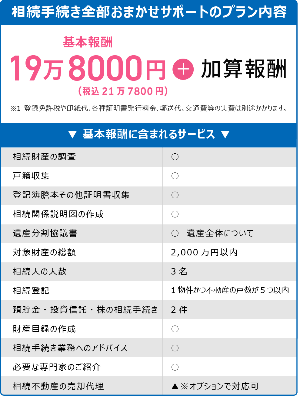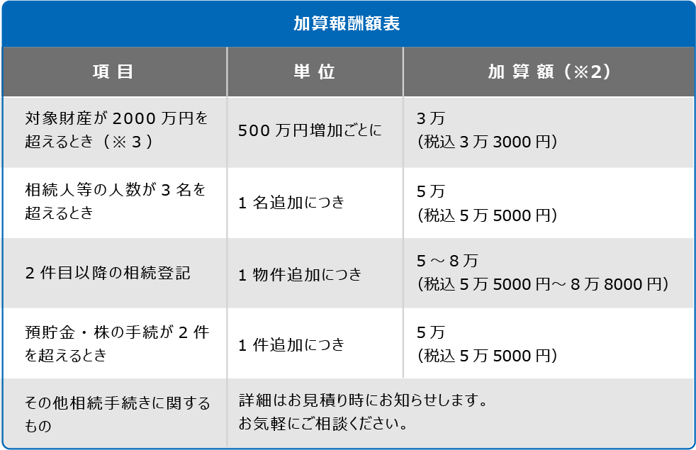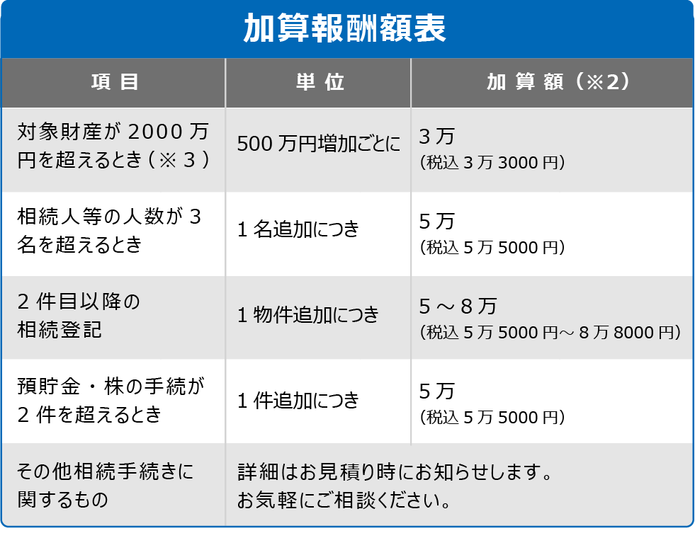 | 相続人等の人数が3名を超えるとき | 1名追加につき3万円(税込3万3000円) |